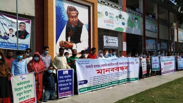 চাকরি সরকারি করনের দাবীতে মানিকগঞ্জে মানববন্ধন