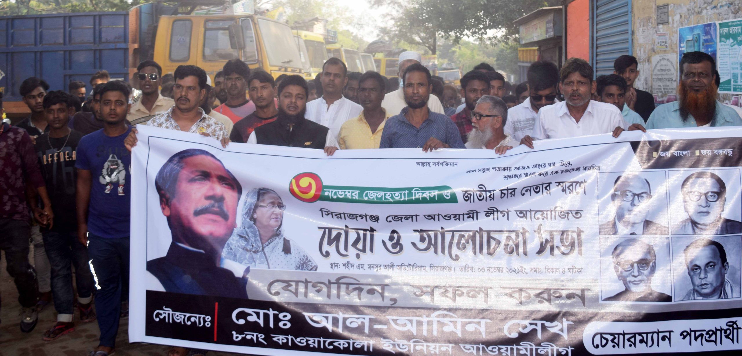 যুগের কথা প্রতিবেদক : জেলহত্যা দিবস উপলক্ষে সিরাজগঞ্জ সদর উপজেলার ৮নং কাওয়াকোলা ইউনিয়ন পরিষদ নির্বাচনে চেয়ারম্যান পদে আওয়ামীলীগ থেকে মনোনীত প্রত্যাশী মো.আল-আমিন সেখের উদ্যোগে শোক র্যালী বের করা হয়েছে। বিকেল তিনটার দিকে শহরের রেলওয়ে কলোনী থেকে শোক র্যালীটি বের করা হয়। র্যালটি ট্রাক শ্রমিক অফিস ও বাজার স্টেশন হয়ে শহীদ এম.মনসুর আলী অটিটোরিয়ামে জেলা আওয়ামীলীগ আয়োজিত জাতীয় চারনেতা স্মরনে আলোচনা ও দোয়া মাহফিলে অংশগ্রহন করেন।
