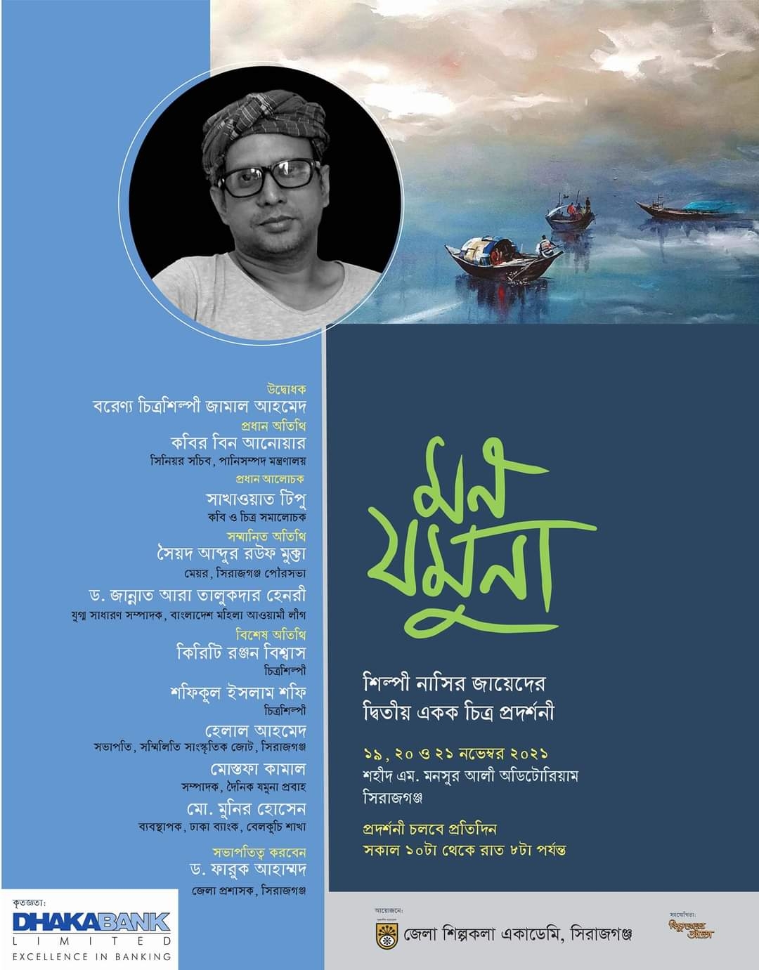 আগামী ১৯ থেকে ২১ নভেম্বর ২০২১ইং পর্যন্ত সিরাজগঞ্জ জেলা শিল্পকলা একাডেমী এর আয়োজনে শহীদ এম. মনসুর আলী অডিটোরিয়ামে শিল্পী নাসির জায়েদের দ্বিতীয় একক চিত্র ‘মন যমুনা’ প্রদর্শনী অনুষ্ঠিত হবে। দ্বিতীয় একক চিত্র ‘মন যমুনা’ উদ্বোধন করবেন বরেণ্য চিত্রশিল্পী জামাল আহমেদ। সিরাজগঞ্জ জেলা প্রশাসক ফারুক আহম্মেদ এর সভাপতিত্বে প্রধান অতিথি হিসেবে উপস্থিত থাকবেন পানিসম্পদ মন্ত্রণালয়ের সিনিয়র সচিব কবির বিন আনোয়ার। প্রধান আলোচক হিসেবে উপস্থিত থাকবেন কবি ও চিত্র সমালোচক সাখাওয়াত টিপু। সম্মানিত অতিথি হিসেবে উপস্থিত থাকবেন পৌর মেয়র আব্দুর রউফ মুক্তা, বাংলাদেশ মহিলা আওয়ামী লীগের যুগ্ম সাধারণ সম্পাদক ড. জান্নাত আরা তালুকদার হেনরী। বিশেষ অতিথি উপস্থিত থাকবেন চিত্রশিল্পী কিরিটি রঞ্জন বিশ্বাস, চিত্রশিল্পী শফিকুল ইসলাম শফি। সিরাজগঞ্জ সম্মিলিতি সাংস্কৃতিক জোট এর সভাপতি হেলাল আহমেদ, দৈনিক যমুনা প্রবাহ পত্রিকার সম্পাদক মোস্তফা কামাল, ঢাকা ব্যাংক এর বেলকুচি শাখার ব্যবস্থাপক মো: মুনির হোসেন। প্রদর্শনী চলবে প্রতিদিন সকাল ১০টা থেকে রাত্রী ৮টা পর্যন্ত।