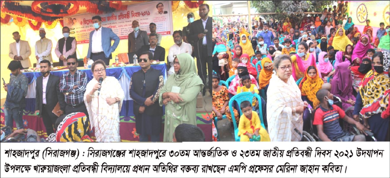 গতকাল শুক্রবার খারুয়াজংলা বিদ্যালয় প্রাঙ্গণে প্রধান অতিথি হিসেবে বক্তব্য রাখেন এমপি প্রফেসর মেরিনা জাহান কবিতা। তিনি বলেন, এসব কোমলমতি বাচ্চাদের আপনারা প্রতিবন্ধী বলবেন না। এদের বেশি বেশি ভালোবাসতে হবে। তিনি আরও বলেন, এই বিদ্যালয়ের উন্নয়নের জন্য আমি সহযোগিতা করবে।