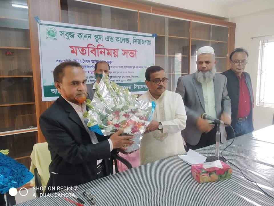 সিরাজগঞ্জ শহরের প্রানকেন্দ্রে অবস্থিত সবুজ কানন স্কুল এন্ড কলেজে মতবিনিময় সভা অনুষ্ঠিত হয়েছে। শনিবার সকাল ১১ টায় প্রতিষ্ঠান প্রধান মোঃ: আব্দুল হালিম এর সভাপতিত্বে প্রতিষ্ঠানের সৈয়দ আব্দুর রউফ মুক্তা লাইব্রেরী তে অনুষ্ঠিত মতবিনিময় সভায় প্রধান অতিথি হিসাবে উপস্থিত থেকে বক্তব্য রাখেন সিরাজগঞ্জ পৌরসভার মেয়র ও সবুজ কানন স্কুল এন্ড কলেজের দাতা সদস্য সৈয়দ আব্দুর রউফ মুক্তা।