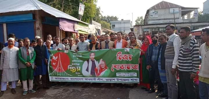 আওয়ামী লীগের দলীয় কার্যালয় থেকে বিজয় শোভা যাত্রাটি পৌর শহরের প্রধান প্রধান সড়ক প্রদক্ষিণ করে। বিজয় শোভাযাত্রায় উপজেলা আওয়ামী লীগের সভাপতি আব্দুস সামাদ খন্দকার, উপজেলা আওয়ামী লীগের সাধারণ সম্পাদক সঞ্জিত কর্মকার, উপজেলা আওয়ামী লীগের সহ-সভাপতি ও সগুনা ইউনিয়নের চেয়ারম্যান প্রার্থী নজরুল ইসলাম চৌধুরী, উপজেলা আওয়ামী লীগের যুগ্ন সাধারণ সম্পাদক রজত কুমার ঘোষ, মোঃ শাহিনুর ইসলাম লাবু, সাংগঠনিক সম্পাদক খলিলুর রহমান, নজরুল ইসলাম বাচ্চু, উপজেলা আওয়ামী যুবলীগের সাধারণ সম্পাদক ও সাবেক ভাইস চেয়ারম্যান ফরহাদ আলী বিদ্যুৎ, পৌর আওয়ামী লীগের আহ্বায়ক আব্দুল রাজ্জাক, যুব মহিলা লীগের সভাপতি শিল্পী খাতুন সহ আওয়ামী লীগের সহযোগী সংগঠনের বিভিন্ন পর্যায়ের নেতৃবৃন্দ বিজয় শোভাযাত্রায় অংশ গ্রহণ করেন।