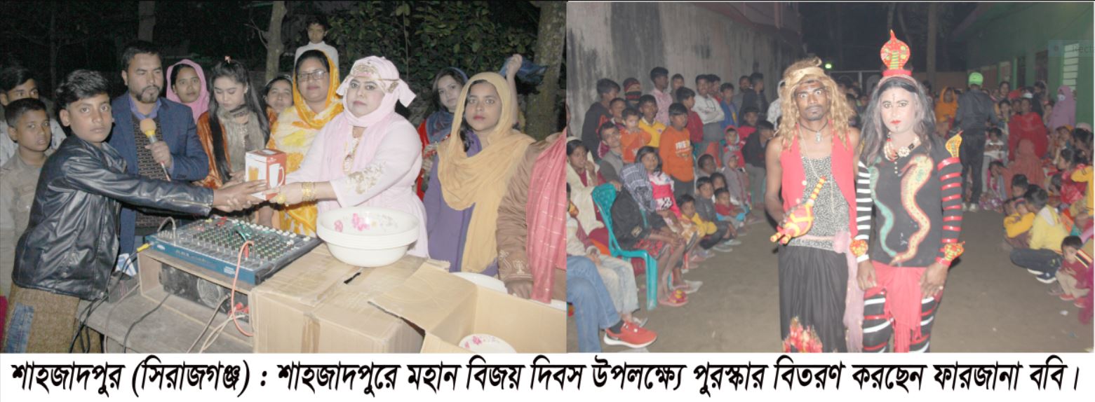 শাহজাদপুরে মহান বিজয় দিবস উপলক্ষ্যে গত বুধবার বিকেলে দরগাপাড়া মহল্লায় সাংস্কৃতিক অনুষ্ঠানসহ নানা ধরণের কর্মসূচী পালন করা হয়। এদিন বিকেল দৌঁড় খেলা, চেয়ার খেলা, পানি পানের প্রতিযোগিতাসহ ৮টি ইভেন্টে খেলা অনুষ্ঠিত হয়। খেলা শেষে সন্ধ্যায় পুরস্কার বিতরণ করেন বিশিষ্ট সমাজ সেবক ফারজানা ববি। এ সময় উপস্থিত ছিলেন, বিশিষ্ট ব্যক্তিত্ব আবুল কাশেম, রাকিব হোসেন, আমজাদ হোসেন, রেখা চৌধুরী প্রমুখ। শেষে মনোজ্ঞ সাংস্কৃতিক অনুষ্ঠান পরিবেশন করা হয়। স্বাধীনতার সুবর্ণজয়ন্তীর বছরে মহান বিজয় দিবস ও মহাবিজয়ের মহানায়ক জাতির পিতা বঙ্গবন্ধু শেখ মুজিবুর রহমান-এর জন্মশতবার্ষিকী উপলক্ষ্যে ব্যক্তিগত আয়োজনে এ অনুষ্ঠান পালন করা হয়।