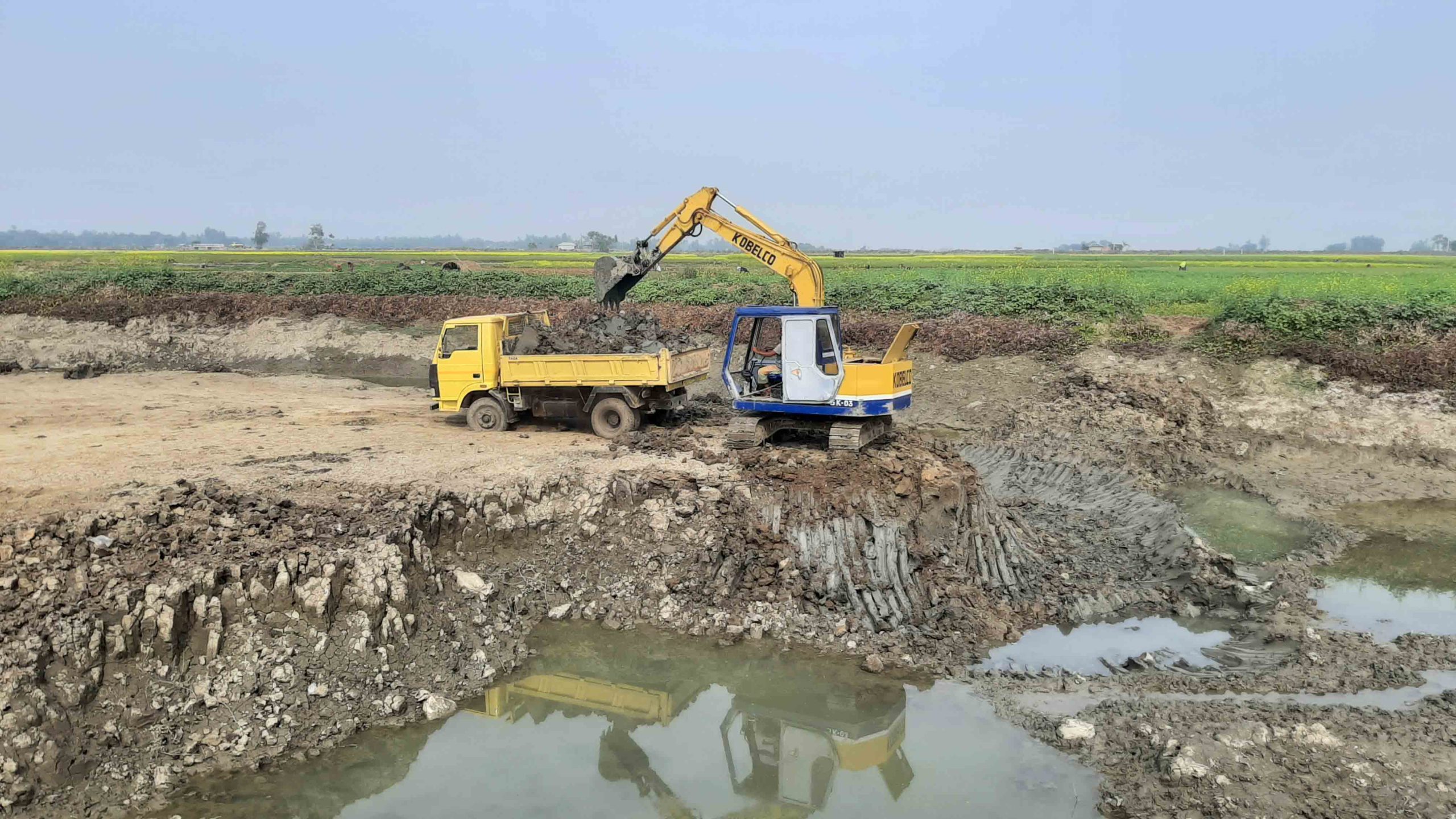 সোমবার দুপুরে সরেজমিনে উপজেলার নিমাইচড়া ইউনিয়নের বিন্যাবাড়ি গৌরনগর ছয়আনী বিলে গিয়ে দেখা যায়, এস্কেভেটর দিয়ে বিলের ফসলি জমি কেটে পুকুর খনন করা হচ্ছে। যাদের কোন অনুমোদন নেই। ৫টি মিনি ট্রাক ও কুত্তাগাড়ি (শ্যালো ইঞ্জিন দ্বারা তৈরি ট্রলি) দিয়ে মাটি বিক্রি করা হচ্ছে স্থানীয় ইটভাটাসহ বিভিন্ন স্থানে। বিলের মাঝখানে নিচু জমি হওয়ায় দূর থেকে দেখে বোঝার উপায় নেই। খোঁজ নিয়ে জানা গেলো, লিটন, বাবু, সাইফুল সহ কয়েকজন এই মাটি কাটা ও বিক্রির সাথে জড়িত। মাটি নিয়ে যাওয়ার কারণে আশপাশের ফসলি জমি ও চলাচলের সড়ক ক্ষতিগ্রস্থ হচ্ছে। রাতেও চলে মাটি কাটা। রাতে থাকার জন্য পাশেই খড় দিয়ে একটি টঙ ঘর বানিয়ে নেয়া হয়েছে।