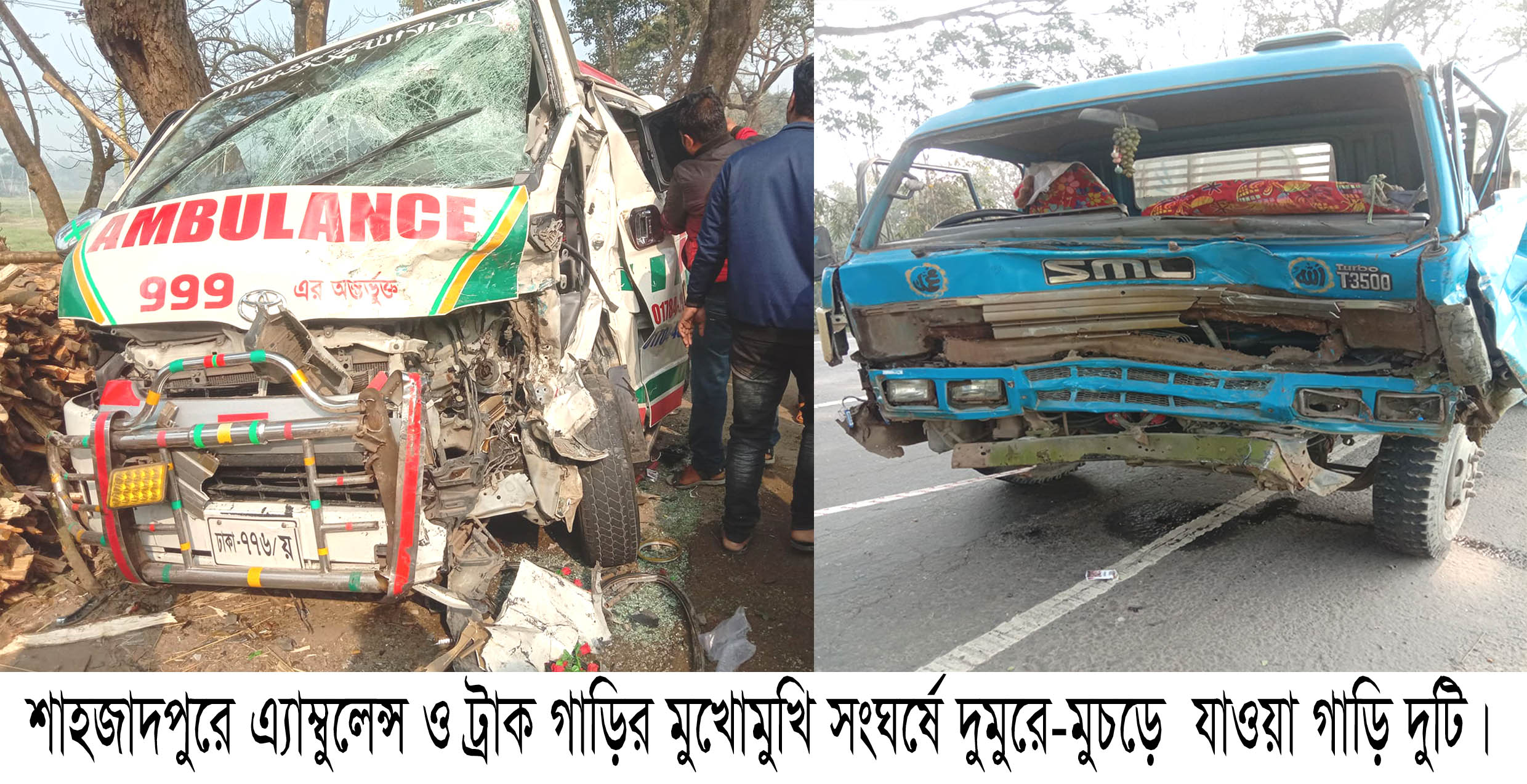 গতকাল শনিবার শাহজাদপুর হতে ছেড়ে আসা একটি ট্রাক নম্বর সিরাজগঞ্জ-ড ১১-০৪২২ ও বিপরীত দিকে উল্লাপাড়া হতে শাহজাদপুর গ্রামি একটি এ্যাম্বুলেন্সের সাথে সংঘর্ষ হয়।