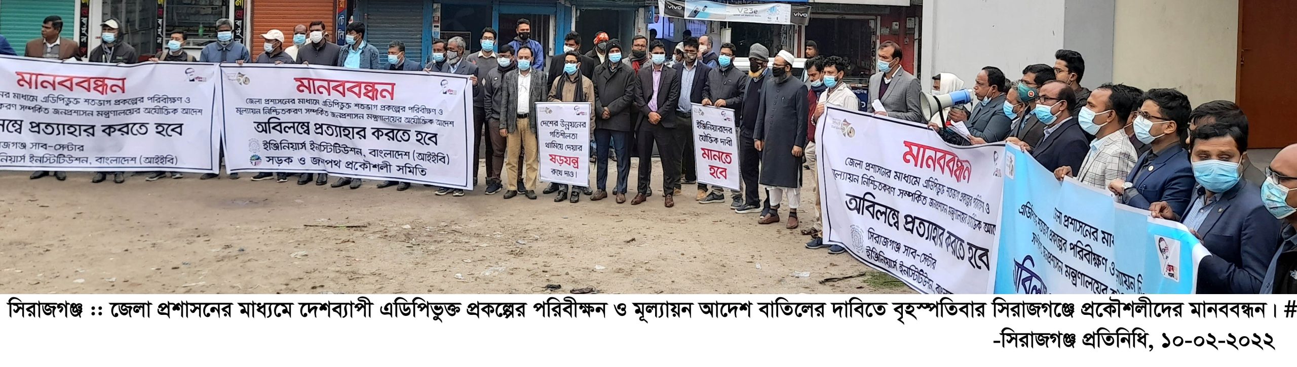 জেলা প্রশাসনের মাধ্যমে দেশব্যাপী এডিপিভুক্ত শতভাগ প্রকল্পের পরিবীক্ষন ও মূল্যায়নের দায়িত্ব প্রদান সম্পর্কীত জনপ্রশাসন মন্ত্রানলয়ের কলো আদেশ বাতিলের দাবিতে সিরাজগঞ্জে প্রকৌশলীদের মানববন্ধন ও প্রতিবাদ