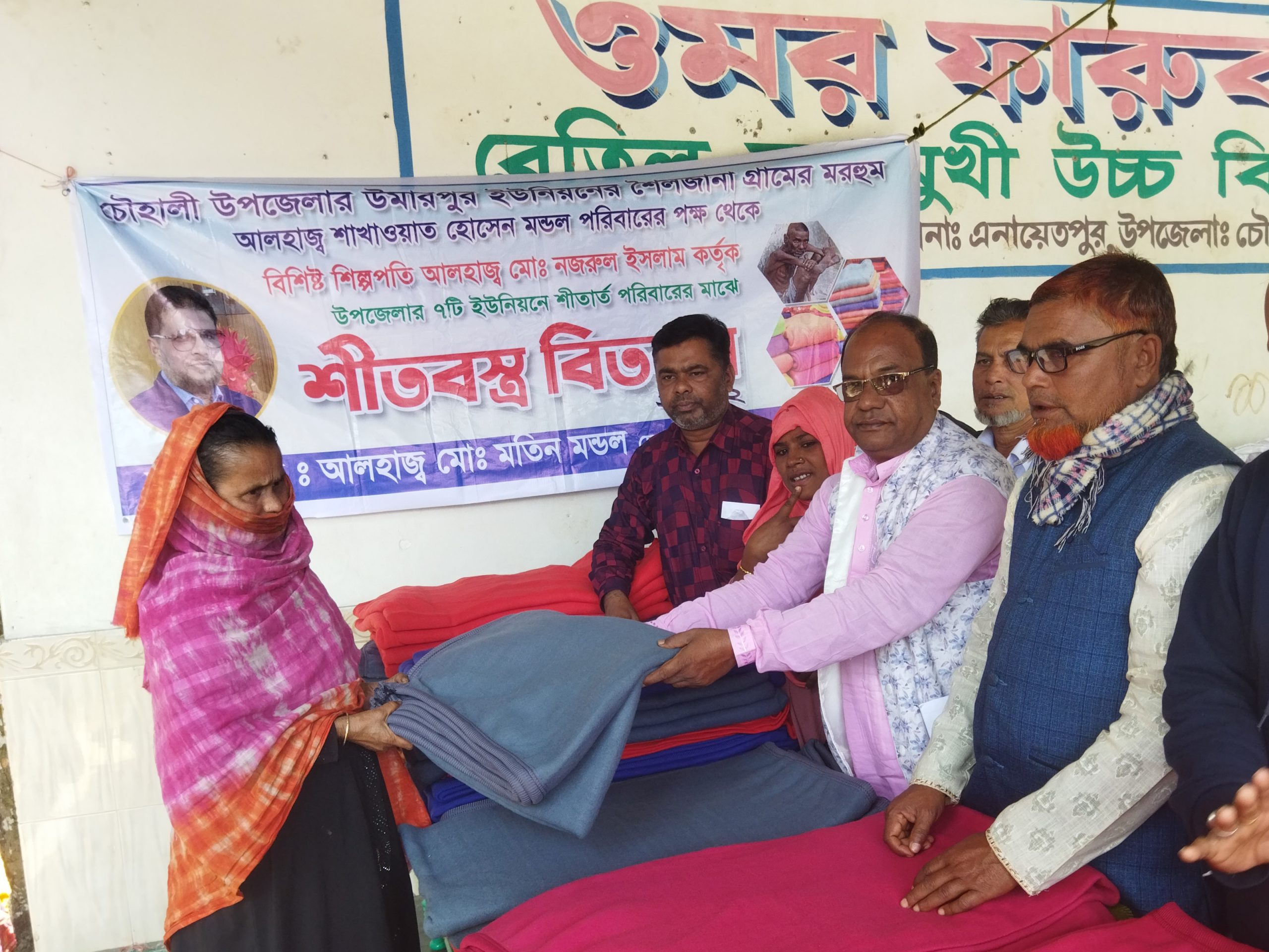এনায়েতপুর প্রতিনিধি : সিরাজগঞ্জের চৌহালী উপজেলার উমারপুর ইউনিয়নের শৈলজানা গ্রামের মরহুম আলহাজ সাখাওয়াত হোসেন মন্ডল পরিবারের পক্ষ থেকে শীতার্তদের মাঝে কম্বল বিতরণ করা হয়েছে।