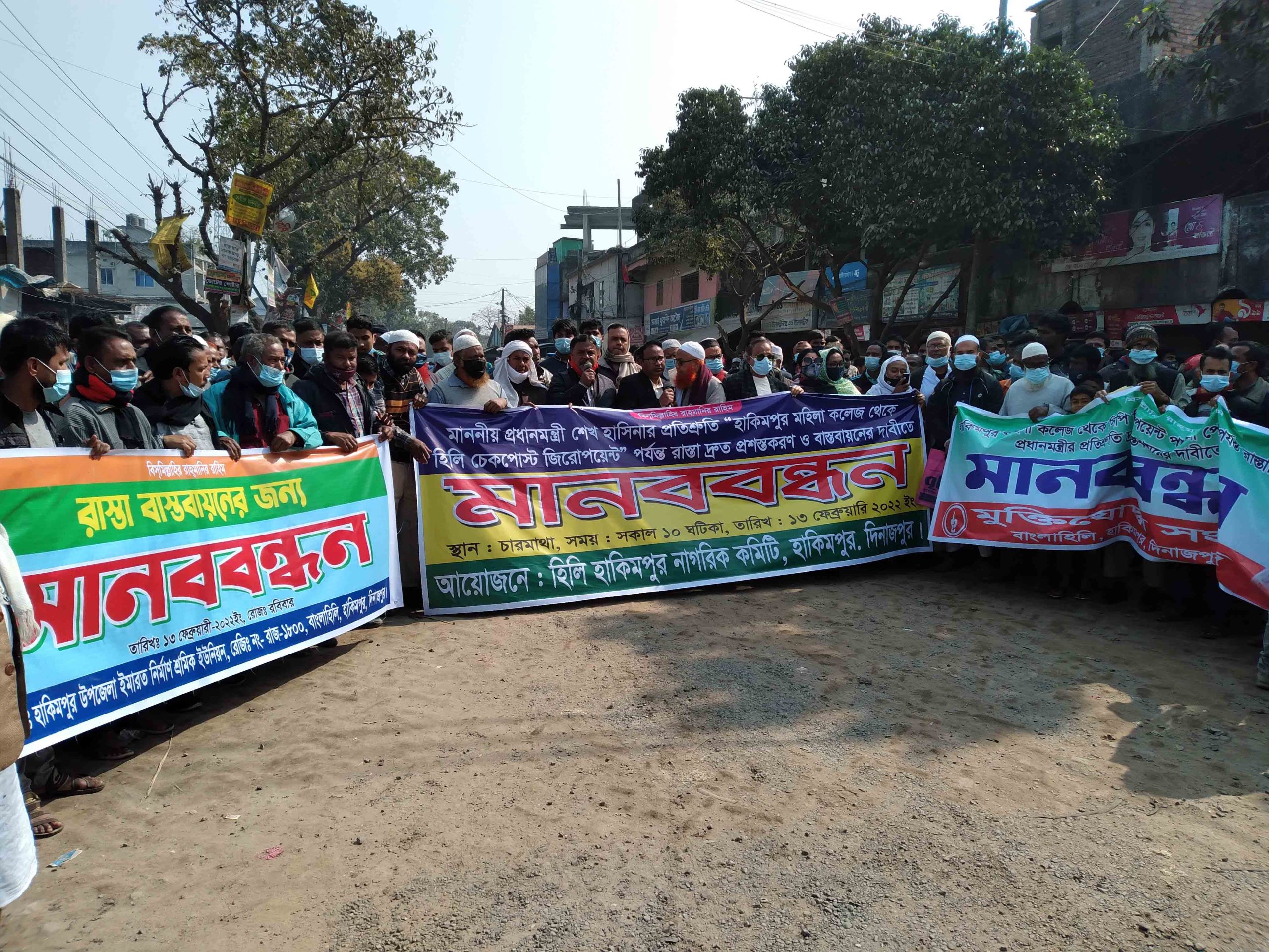 রবিবার সকাল সাড়ে ১০ টায় হিলি চারমাথা মোড়ে হিলি নাগরিক কমিটির উদ্যোগে মানববন্ধন অনুষ্ঠিত হয়।