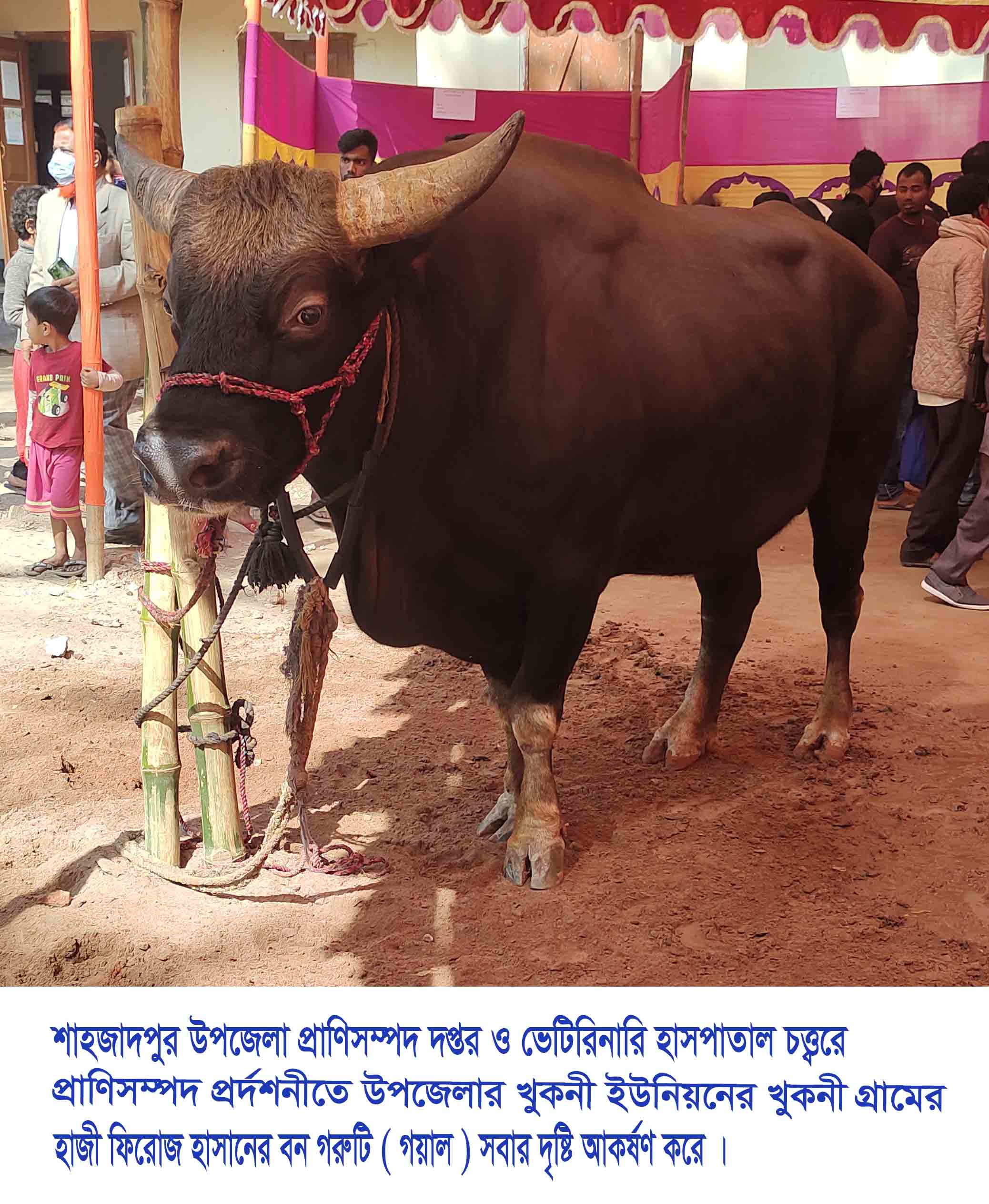 শাহজাদপুর প্রতিনিধি : গতকাল বুধবার শাহজাদপুর উপজেলা প্রাণিসম্পদ দপ্তর ও ভেটিরিনারি হাসপাতাল চত্ত্বরে হয়ে গেল প্রাণিসম্পদ প্রর্দশনী। উপজেলার খুকনী ইউনিয়নের খুকনী গ্রামের হাজী ফিরোজ হাসানের বন গরুটি (গয়াল) সবার দৃষ্টি আকর্ষণ করে। তাই হাজী ফিরোজ হাসান প্রথম পুরস্কার জিতে নিলেন।