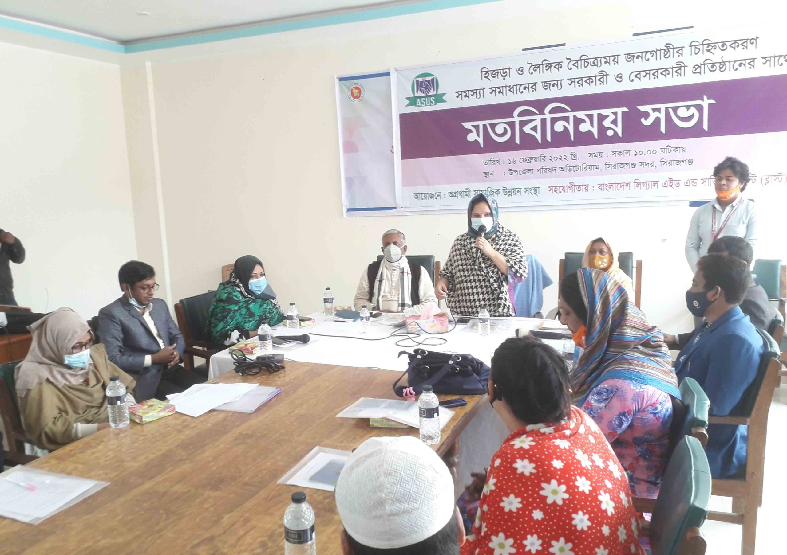 যুগের কথা প্রতিবেদক : সিরাজগঞ্জে হিজড়া ও লৈঙ্গিক বৈচিত্র্যময় জনগোষ্ঠীর চিহ্নিত করণ সমস্যা সমাধানের জন্য সরকারী ও বেসরকারী প্রতিষ্ঠানের সাথে মতবিনিময় সভা অনুষ্ঠিত হয়েছে। বুধবার ১৬ ফেব্র“য়ারী সকাল ১০ টায় সদর উপজেলা পরিষদ অডিটোরিয়ামে এ সভার আয়োজন করেন অগ্রগামী সামাজিক উন্নয়ন সংস্থা।