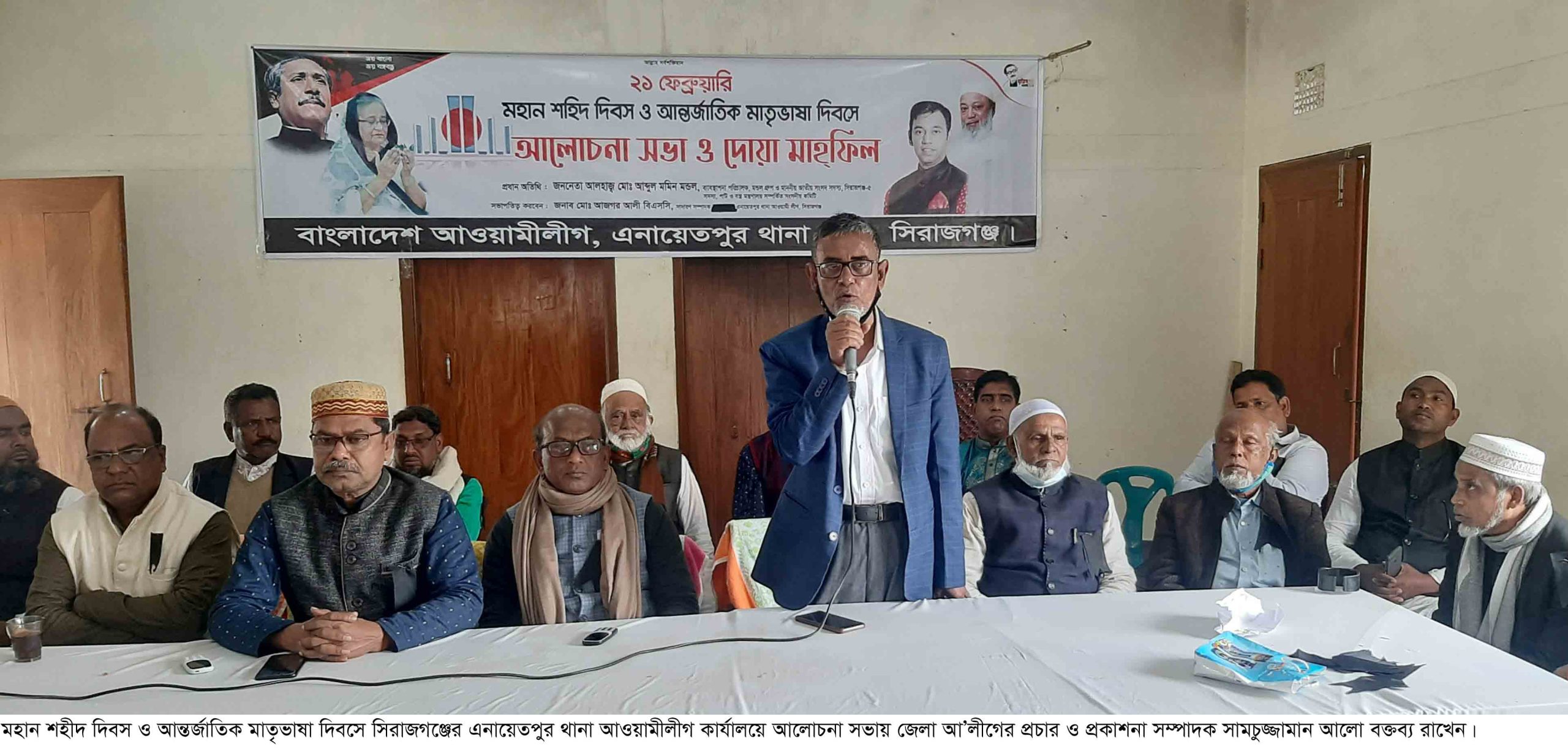 এনায়েতপুর প্রতিনিধি : সিরাজগঞ্জের এনায়েতপুর থানা আওয়ামীলীগের উদ্যোগে মহান শহীদ দিবস ও আন্তর্জাতিক মাতৃভাষা দিবস পালন উপলক্ষ্যে শহীদ মিনারে শ্রদ্ধার্ঘ্য নিবেদন শেষে দলীয় কার্যালয়ে আলোচনা সভা অনুষ্ঠিত হয়েছে।