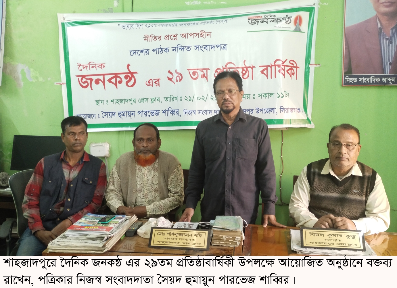 দৈনিক জনকন্ঠের শাহজাদপুর উপজেলার নিজস্ব সংবাদদাতা সৈয়দ হুমায়ুন পারভেজ শাবিক্ষরের সভাপতিত্বে অনুষ্ঠিত আলোচনা সভায় প্রধান অতিথি ছিলেন, শাহজাদপুর প্রেস ক্লাবের সভাপতি বিমল কুন্ডু। এতে বিশেষ অতিথি হিসেবে উপস্থিত ছিলেন, প্রেস ক্লাবের সাধারণ সম্পাদক ছিলেন, শফিকুজ্জামান শফি।