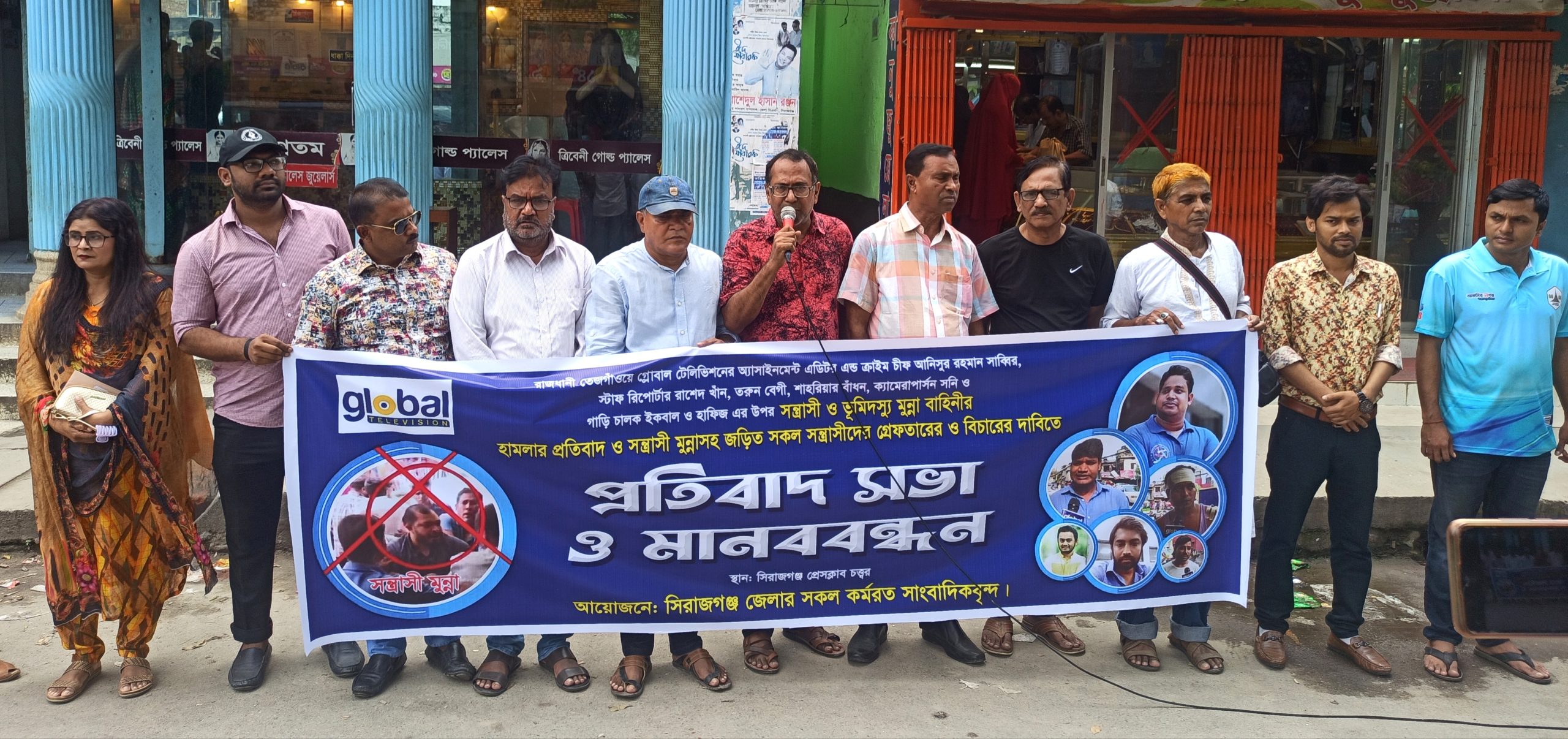 গ্লােবাল টেলিভিশনের সংবাদকর্মীদের উপর সন্ত্রাসী হামলার প্রতিবাদে সিরাজগঞ্জে মানববন্ধন