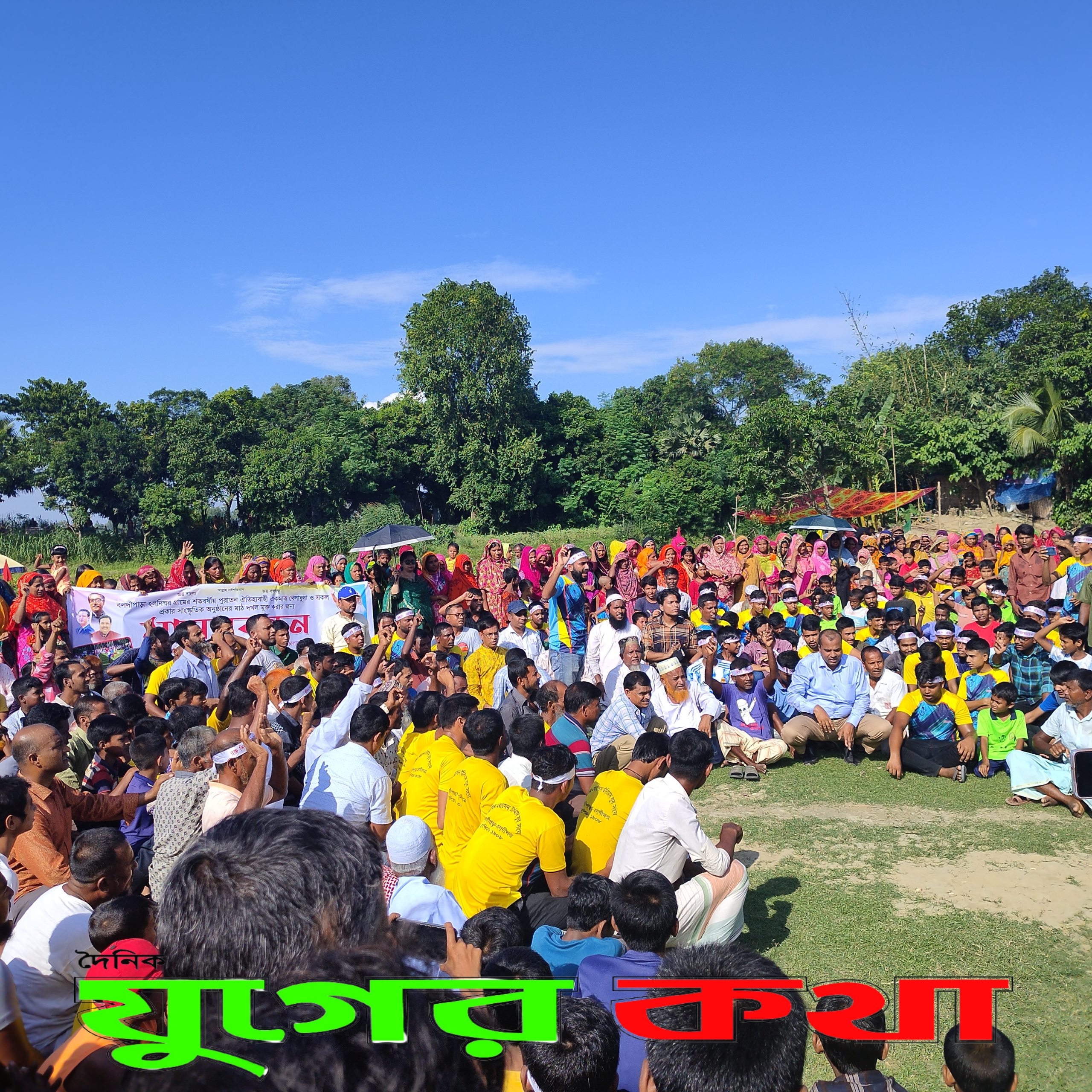 শনিবার বিকেল ৪টায় বলদিপাড়া গ্রামের খেলার মাঠ প্রাঙ্গনে মাঠ রক্ষার জন্য প্রধানমন্ত্রীর হস্তক্ষেপ কামনা করে এ মানববন্ধন করেন হাজারও নারী পুরুষ।