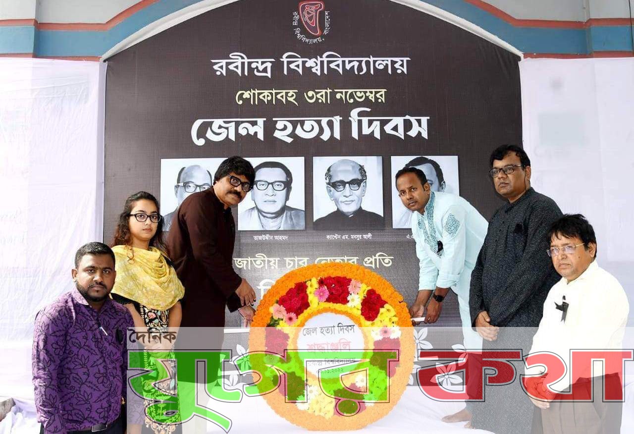 ৩রা নভেম্বর, বৃহস্পতিবার রবীন্দ্র বিশ্ববিদ্যালয়ে যথাযথ মর্যাদায় জেল হত্যা দিবস পালন করা হয়েছে। সকাল ৯:০০ টায় কালো ব্যাচ ধারণের মধ্য দিয়ে দিবসের কর্মসূচির সূচনা করা হয়। এরপর বেলা ১১:৩০ মিনিটে রবীন্দ্র বিশ্ববিদ্যালয়ের অ্যাকাডেমিক ভবন ১-এ চার নেতার প্রতিকৃতিতে পুষ্পস্তবক অর্পণ করেন বিশ্ববিদ্যালয়ের মাননীয় উপাচার্য প্রফেসর ড. মোঃ শাহ্ আজম। এ সময় আরও উপস্থিত ছিলেন বিশ্ববিদ্যালয়ের সকল বিভাগের শিক্ষক, শিক্ষার্থী, বিভিন্ন দপ্তরের কর্মকর্তা ও কর্মচারীবৃন্দ। এসময় জাতীয় চার নেতার স্মৃতির প্রতি শ্রদ্ধা জানিয়ে এক মিনিট নীরবতা পালন করা হয়।
