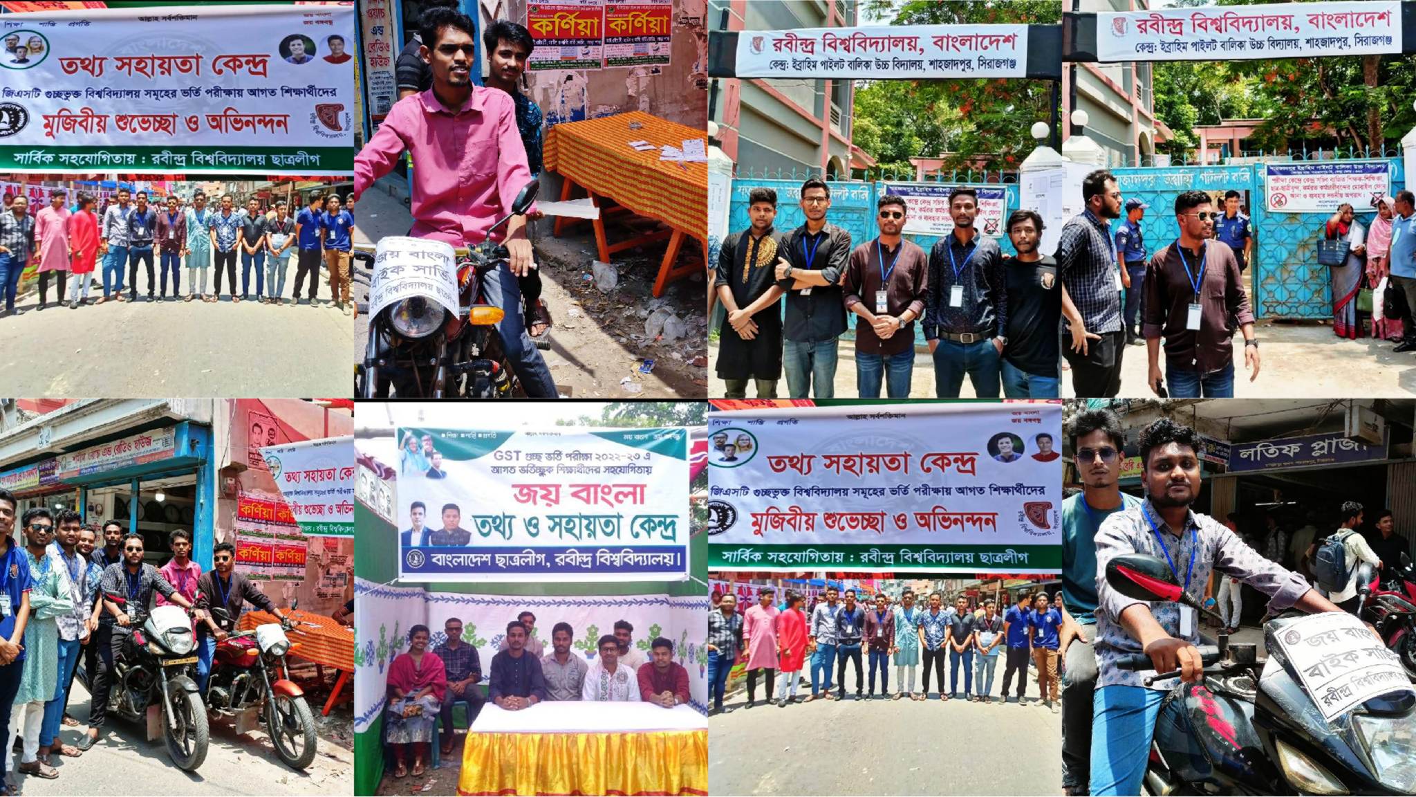 জিএসটি গুচ্ছভুক্ত বিশ্ববিদ্যালয়ের ভর্তি পরীক্ষা ২০২৩ উপলক্ষ্যে রবীন্দ্র বিশ্ববিদ্যালয় কেন্দ্রে বিভিন্ন দিনে অনুষ্ঠিত ভর্তি পরীক্ষায় পরীক্ষার্থী ও অভিভাবকদের বিভিন্ন সহযোগিতা করার মধ্য দিয়ে প্রশংসা কুড়িয়েছে রবীন্দ্র বিশ্ববিদ্যালয় ছাত্রলীগ। ভর্তি পরীক্ষায় আগত শিক্ষার্থীদের জয় বাংলা বাইক সার্ভিস, তথ্য সহায়তা, পরীক্ষার্থীর জিনিসপত্র সংরক্ষণ, অভিভাবকদের বসার ব্যবস্থা করা, নিরাপদ পানি পান এর ব্যবস্থা সহ পরীক্ষা সুষ্ঠুভাবে সম্পন্ন করতে মাঠে সেচ্ছাসেবক হিসেবে শ্রম দেন সংগঠনের নেতাকর্মীরা। ০৩ তারিখ এর পরীক্ষায় বগুড়া থেকে আগত মাহিম হাসান নামে এক পরীক্ষার্থী বলেন, ছাত্রলীগের ভাইরা আমাকে কেন্দ্র পর্যন্ত পৌঁছে দেয় এবং আমার জিনিসপত্র সংরক্ষণ করে রাখেন। তাই আমাকে কোনো ঝামেলায় পড়তে হয়নি। এছাড়াও নওশাবা নামে সিরাজগঞ্জের এক পরীক্ষার্থী বলেন, পরীক্ষা দিতে এসে ছাত্রলীগের ভাইয়াদের সহায়তায় কেন্দ্রে পৌঁছাই। অভিভাবকেরা অনেকেই ছাত্রলীগের স্টলে এই প্রখর রোদে আশ্রয় নেন। এসময় তাদের পানির ব্যবস্থাও করেন কর্মীরা।