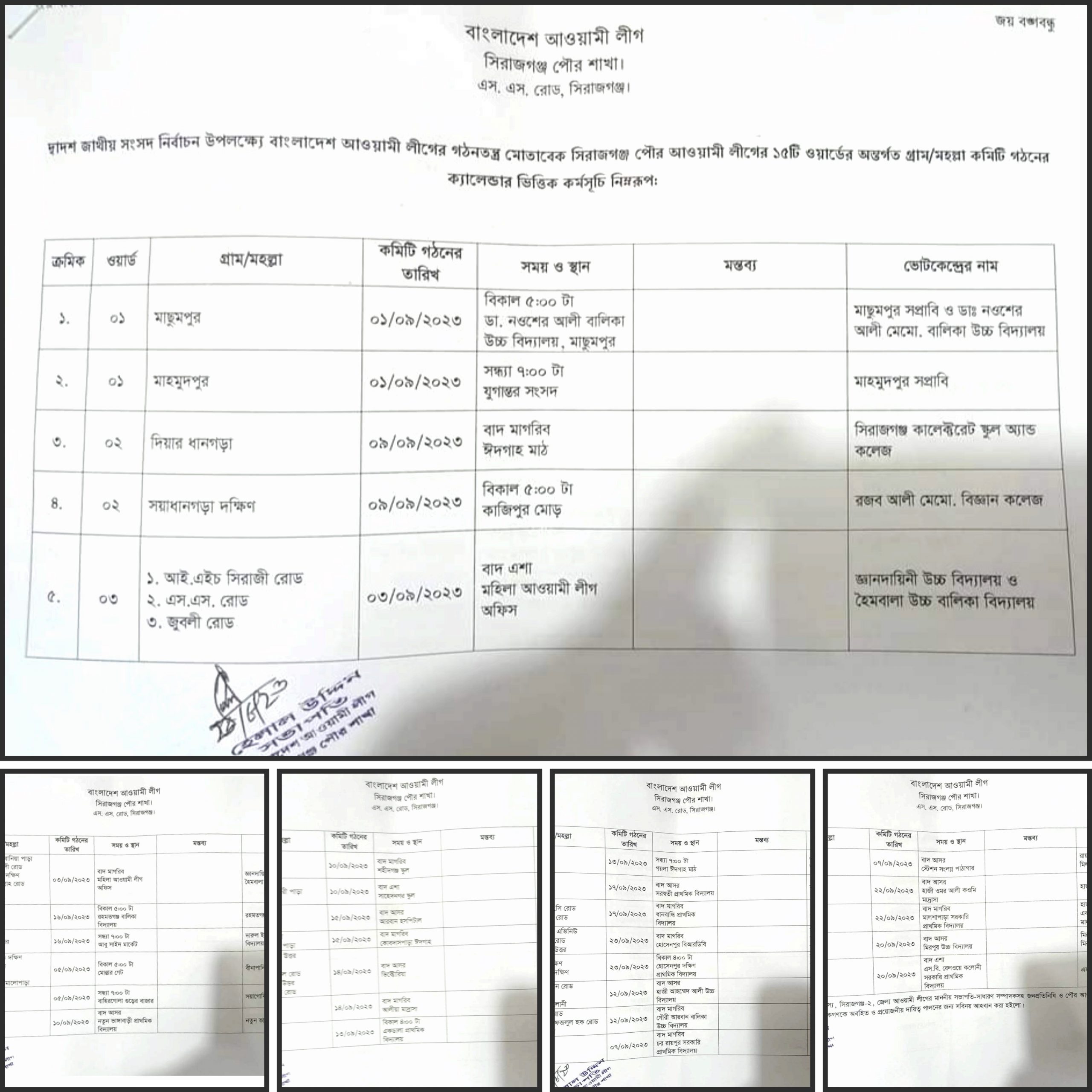 পৌর আওয়ামীলীগের সূত্র জানায়, ক্যালেন্ডারভিত্তিক কর্মসূচির অংশ হিসেবে আগামী ১ সেপ্টেম্বর থেকে সিরাজগঞ্জ পৌর আওয়ামীলীগের ১৫টি ওয়ার্ডের ইউনিট/মহল্লায় আওয়ামীলীগের কমিটি গঠন করা হবে। পুরো মাস জুড়ে এমন ৩৩টি ইউনিটে কমিটি গঠন করা হবে।