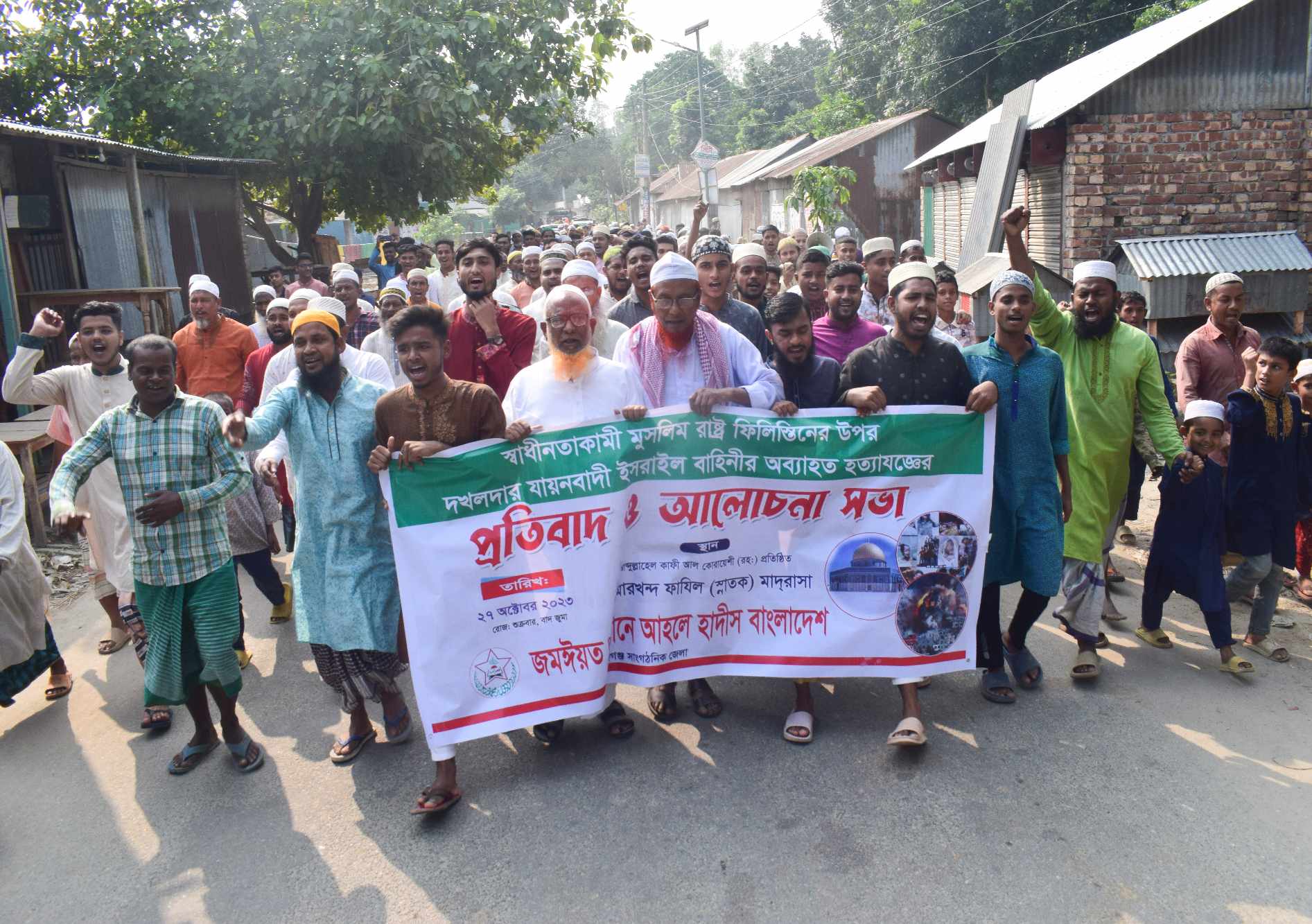 স্বাধীনতাকামী মুসলিম রাষ্ট্র ফিলিস্তিনের ওপর ইসরাইলের অব্যাহত বর্বর,নৃসংশ হত্যাযজ্ঞের প্রতিবাদে সিরাজগঞ্জের কামারখন্দে মানববন্ধন ও বিক্ষোভ মিছিল করেছে মুসল্লিরা।