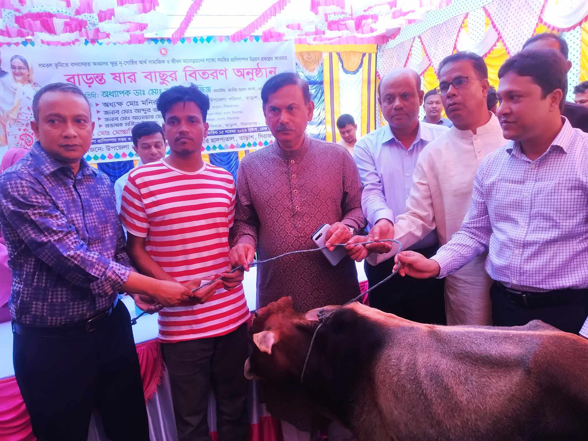 সিরাজগঞ্জের তাড়াশে সমতল ভূমিতে বসবাস রত অনগ্রসর ক্ষুদ্র নৃগোষ্ঠীর আর্থ সামাজিক জীবনমান উন্নয়নে লক্ষ্যে সমম্বিত প্রাণী সম্পদ উন্নয়ন প্রকল্পের আওতায় বাড়ন্ত ষাড় বাছুর বিতরণের উদ্ধোধন করেন সিরাজগঞ্জ-৩ তাড়াশ রায়গঞ্জ ও সলঙ্গা আসনের জাতীয় সংসদ সদস্য অধ্যাপক ডাক্তার মোঃ আব্দুল আজিজ এমপি।