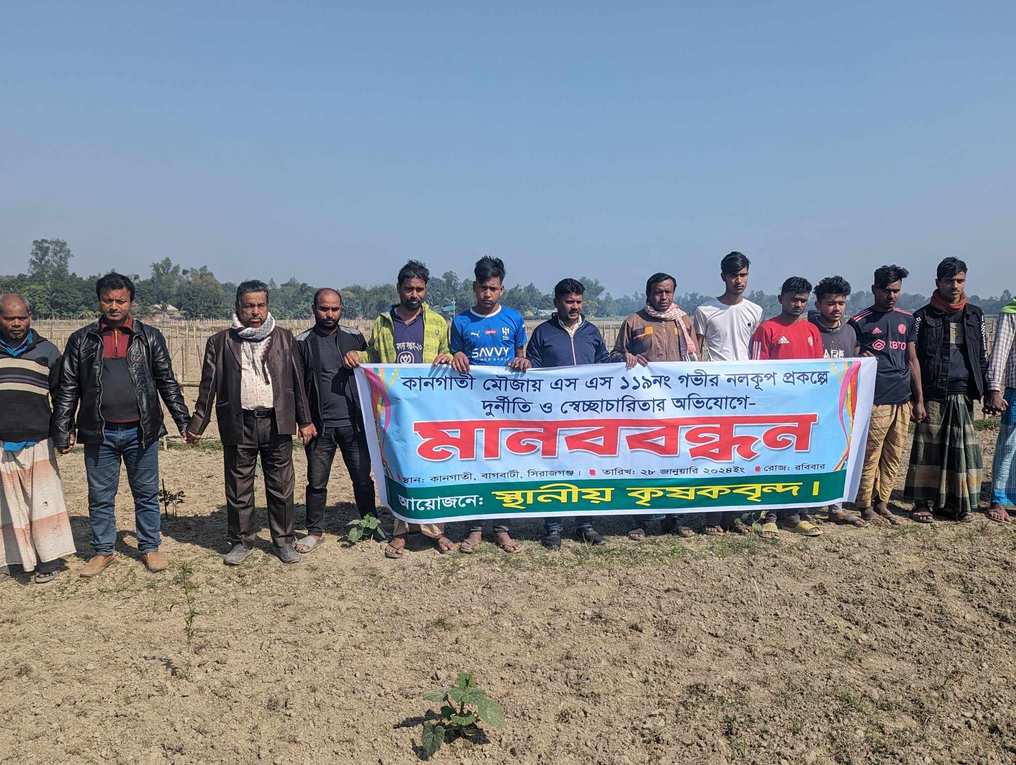 রবিবার সকালের কানগাতিঁর সাধারণ কৃষকদের ব্যানারে গ্রামের কৃষি জমিতে এই মানববন্ধন অনুষ্ঠিত হয়। মানববন্ধনে বক্তারা বলেন, সমিতির মাধ্যমে এস এস ১১৯ সেচ প্রকল্প চালু করা হয়। কিন্তু কিছুদিন ধরে হানিফ মোল্লা প্রকল্পটি তাদের নিজস্ব বলে দাবি করছেন। এই সেচ প্রকল্পের অধিনে ১শ ৫০ বিঘা জমি রয়েছে। কিন্ত সামাজিক বিরোধের জন্য ৫০/৬০ বিঘা জমিতে সঠিক ভাবে সেচের পানি দেওয়া হয় না। আর কিছু কিছু জমিতে একবারেই পানি দেওয়া হয় না। এতে তারা ক্ষতিগ্রস্থ হচ্ছে। পাচ্ছে না কাঙ্খিত ফসল। এই বিষয়ে বিভিন্ন মহলে অভিযোগ করেও তারা এর কোন সমাধান পাচ্ছে না বলে অভিযোগ করা হয় মানববন্ধন থেকে।