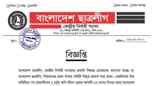 সিরাজগঞ্জ জেলা ছাত্রলীগের কমিটি বিলুপ্ত