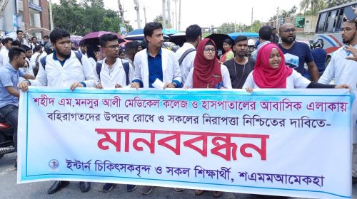 শহীদ এম মনসুর আলী মেডিকেল কলেজ শিক্ষার্থীদের নিরাপত্তার দাবীতে মানববন্ধন