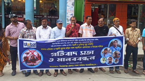 গ্লােবাল টেলিভিশনের সংবাদকর্মীদের উপর সন্ত্রাসী হামলার প্রতিবাদে সিরাজগঞ্জে মানববন্ধন ঢাকায় গ্লােবাল টেলিভিশনের অফিস কার্যালয়ের সামনে গ্লােবাল টেলিভিশনের সাংবাদিকের উপর সন্ত্রাসী হামলার প্রতিবাদে ও সন্ত্রাসীদের দ্রুত গ্রেফতার করে দৃষ্টান্তমূলক শাস্তির দাবিতে…