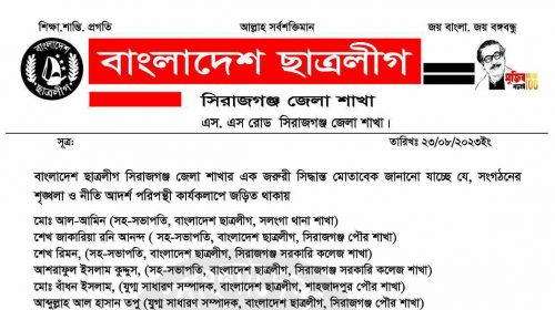 কাজিপুর উপজেলা ছাত্রলীগের সভাপতিসহ ৫ নেতাকে বহিষ্কার